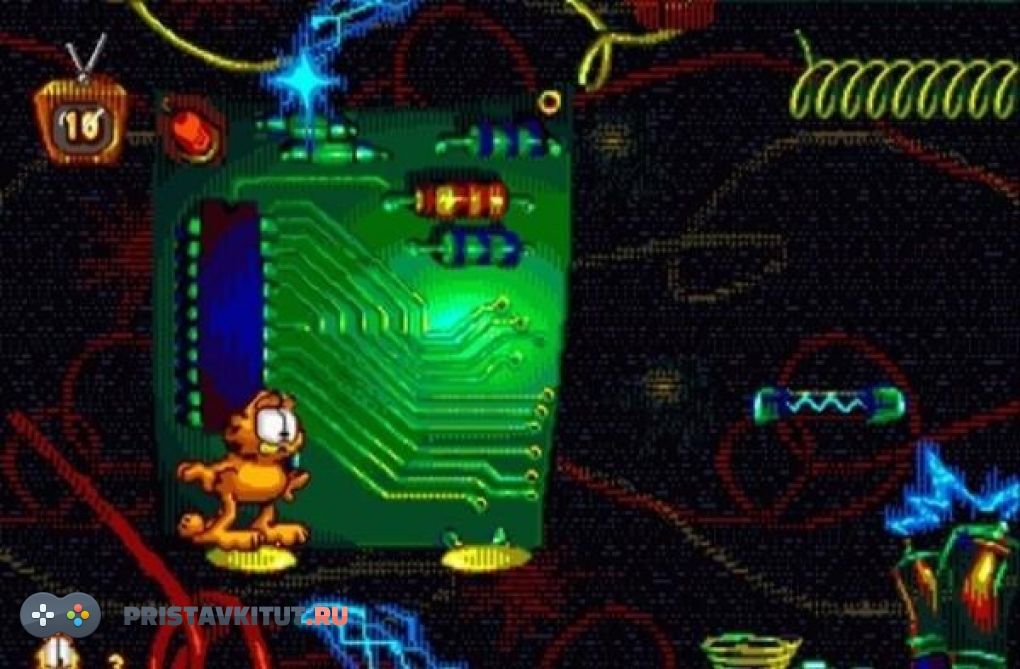 В основу сюжета игры положен мультик, который в прошлом был очень популярен. Сценарий игры построен на сценарии мультфильмов про кота Гарфильда. Толстый кот начинает свои приключения в трехмиллионном году до новой эры, борясь с первобытными людьми и устраивая мелкие пакости. Потом ему предстоит путешествие в Египет, чтобы разгадать проклятие Котлеопатры. Сам характер игры не представляет из себя ничего нового - это старая добрая и очень красивая аркада: графика потрясающая.