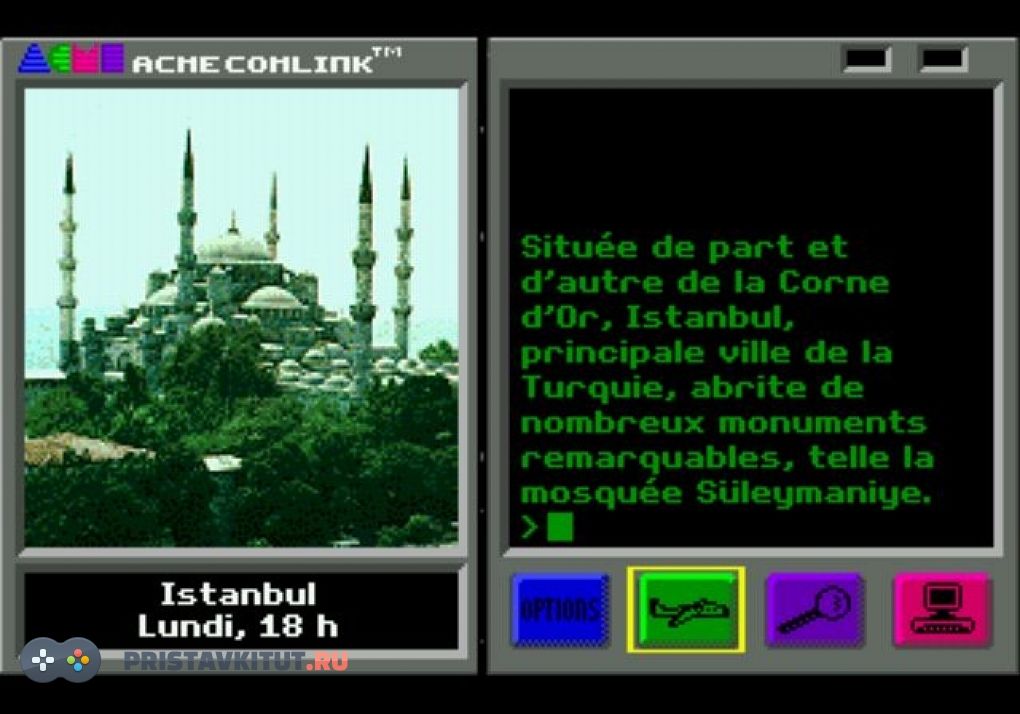 Первая часть серии игр Carmen Sandiego для Sega MegaDrive / Genesis. Вы самый лучший детектив агентства ACME, вам поручено самое сложное и самое срочное задание. Вы должны отыскать и поймать воровку Кармен Сандиего (Carmen Sandiego), взявшуюся за старое. В её поисках вам предстоит облететь весь мир. Предстоит опрос свидетелей, сбор данных и улик. Даже самая мелкая деталь может играть большую роль. Это приключенческая игра, думаю частично её можно отнести к текстовым квестам.