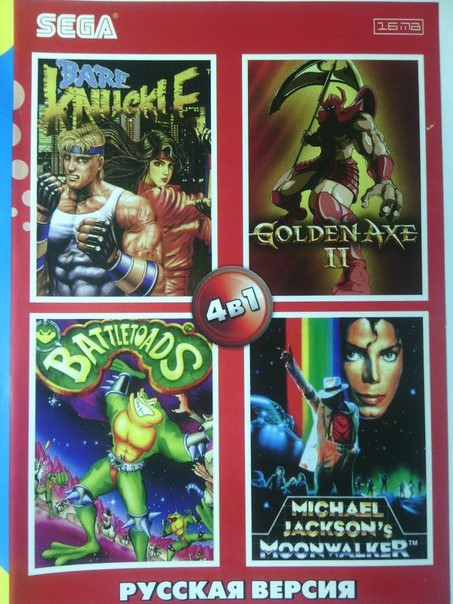 4 игры в одном картридже Bare knukle, Golden axe 2, Moon walker, Battletoads