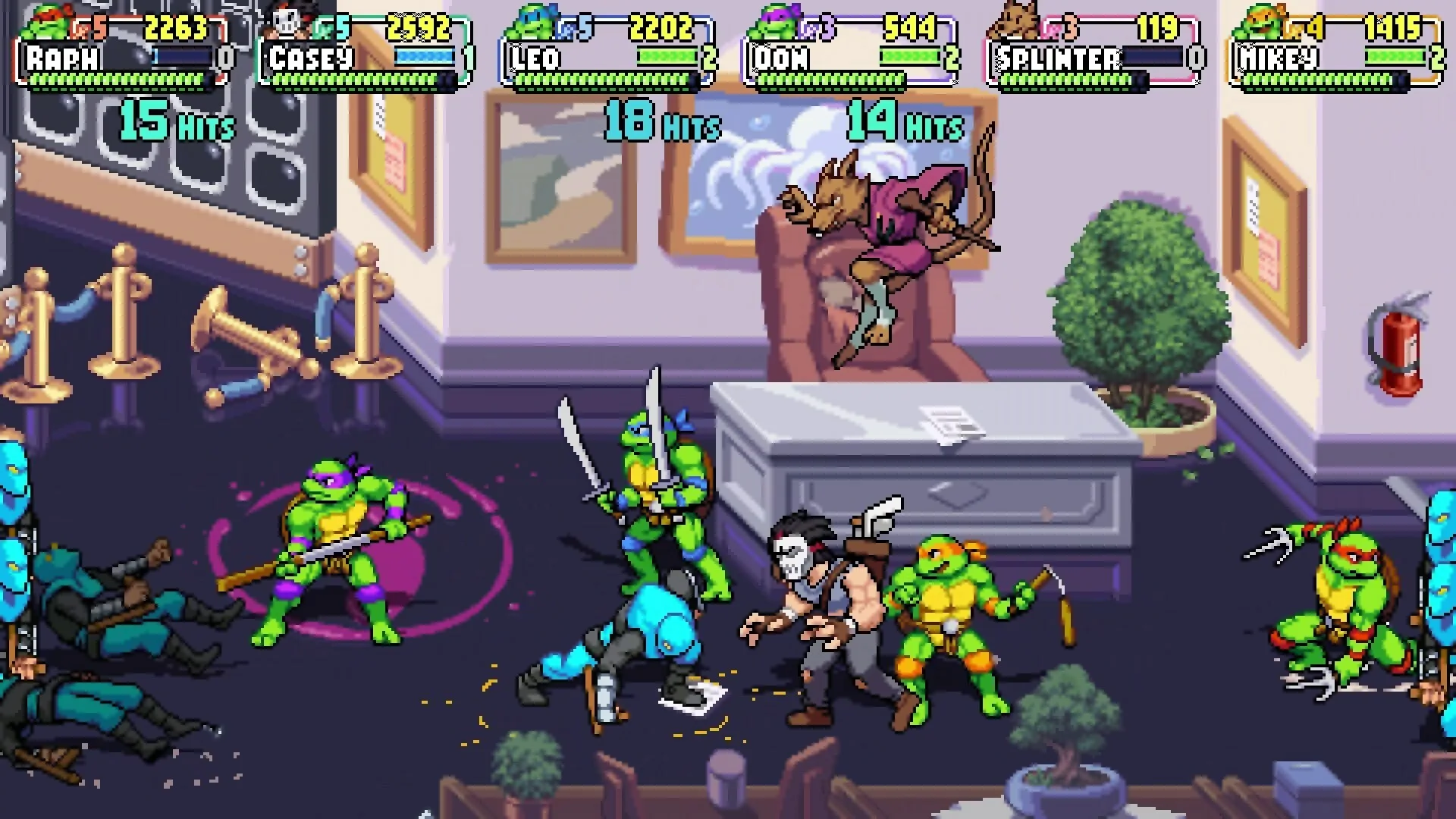Каждый боец в Teenage Mutant Ninja Turtles: Shredders Revenge обладает особыми приемами и набором движений, добавляющими новизны в каждое новое прохождение. Отважная четверка героев в панцирях готова продемонстрировать все те приемы и мастерство владения оружием ниндзя, которым их обучил учитель. Да и сам Сплинтер и репортер 6-го канала Эйприл О’Нил не хуже черепашек способны задать жару прихвостням Шреддера и Крэнга.